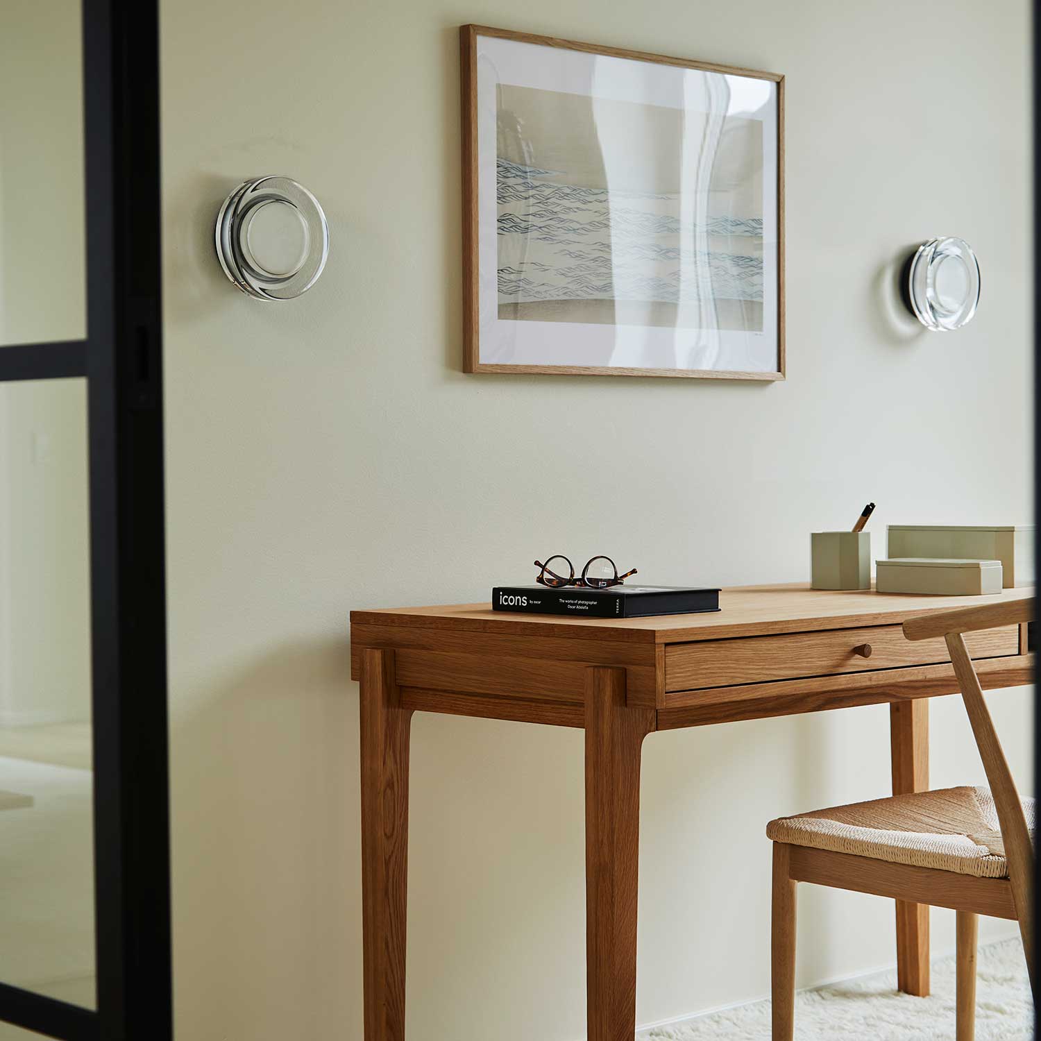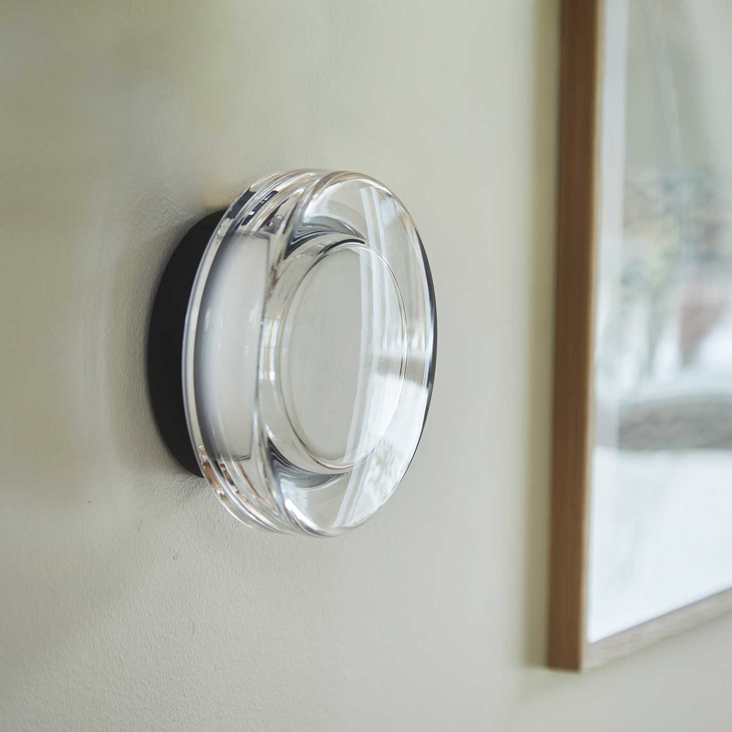 HUGO is a wall light defined by its clean circular form and striking material contrast. The clear acrylic front creates optical depth, allowing the light to appear layered and softly framed. The result is a floating, almost luminous effect on the wall that brings calm and character to the space.