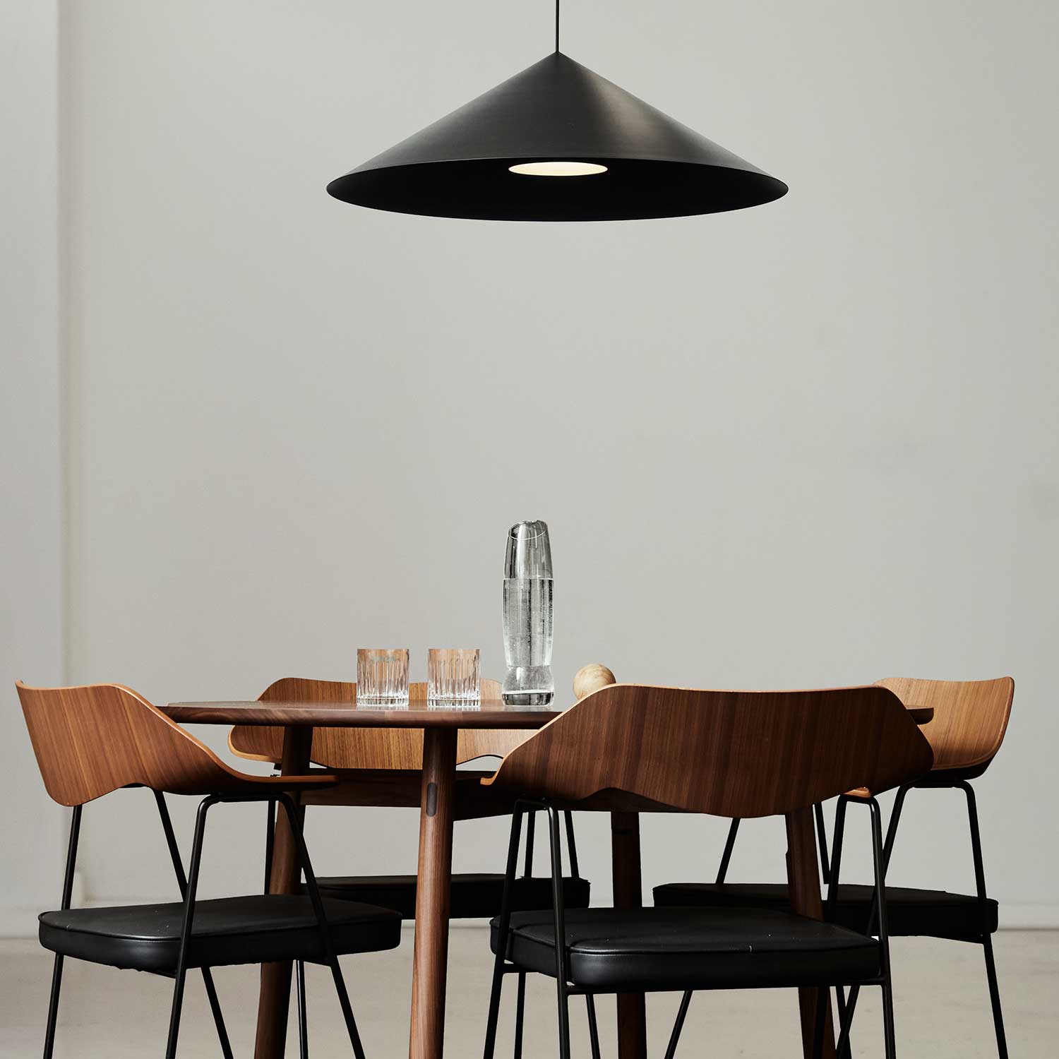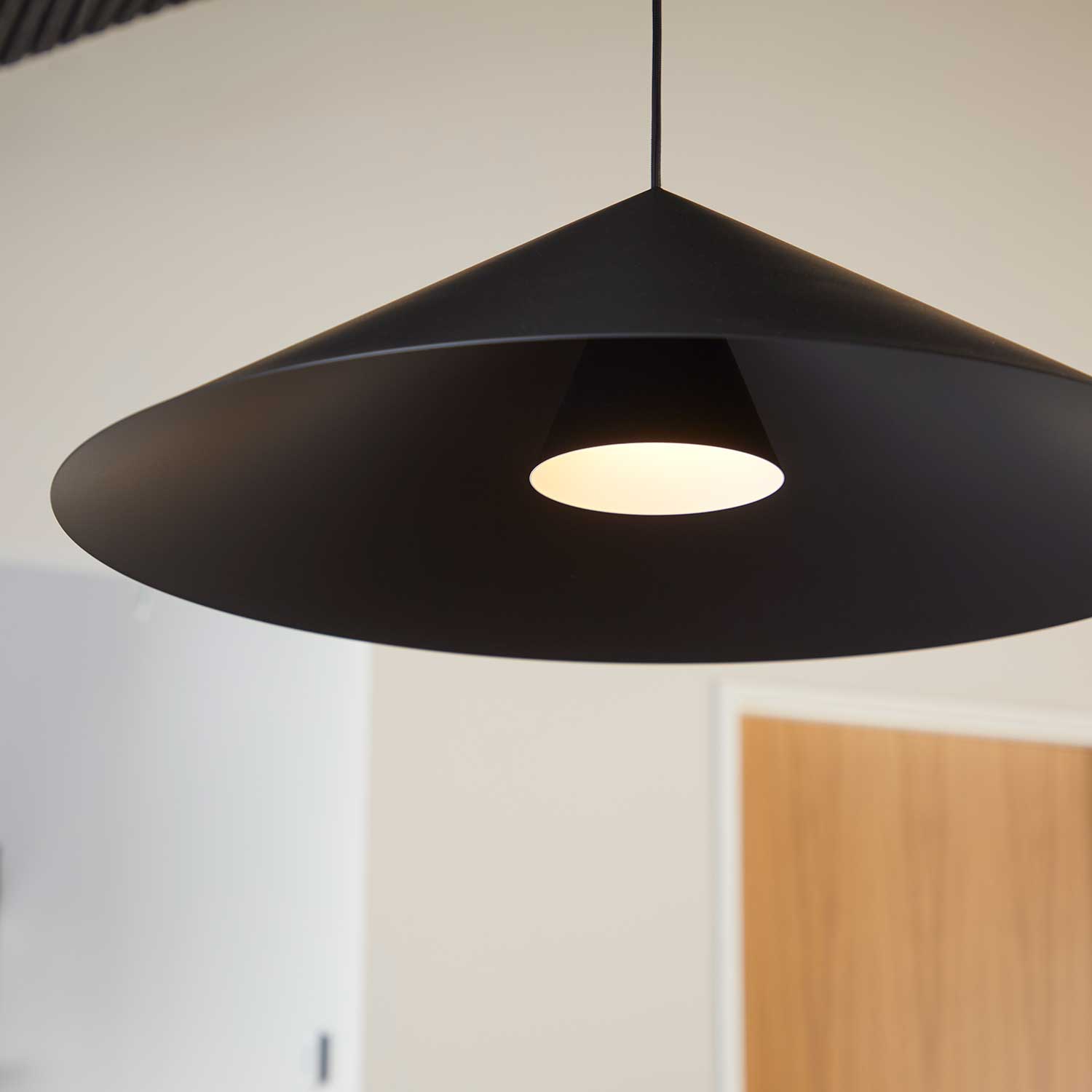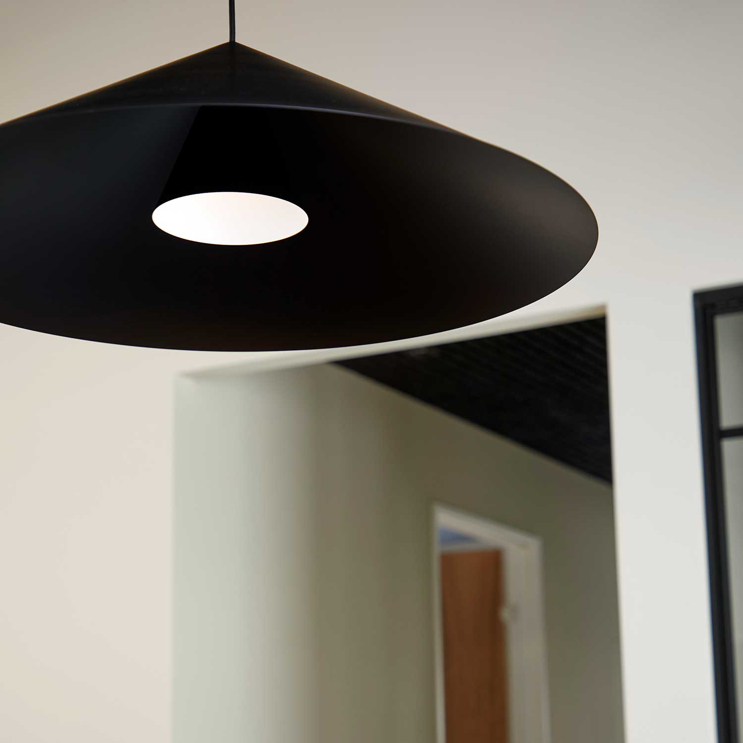 Hanzu 75 is a large black pendant light defined by its clear and carefully considered form. The wide, conical shade gives the light a strong presence and creates a distinct focal point within the space. With its generous diameter, it is designed for interiors where scale and proportion play an important role in the overall composition.