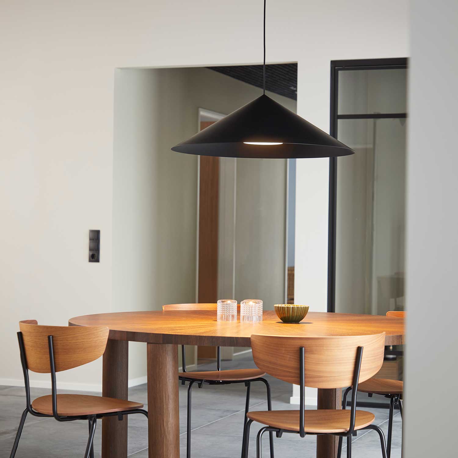 The matte black finish enhances the graphic quality of the design, while the white centre diffuser ensures comfortable and functional downward illumination. The light gathers beneath the fitting, forming a clearly defined lighting zone that works particularly well above larger dining tables, round tables or in open-plan living areas where the pendant is intended to stand out.