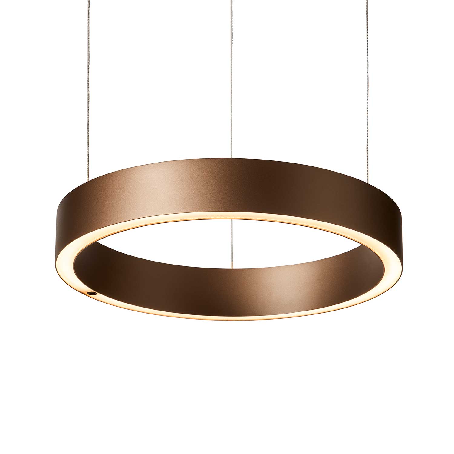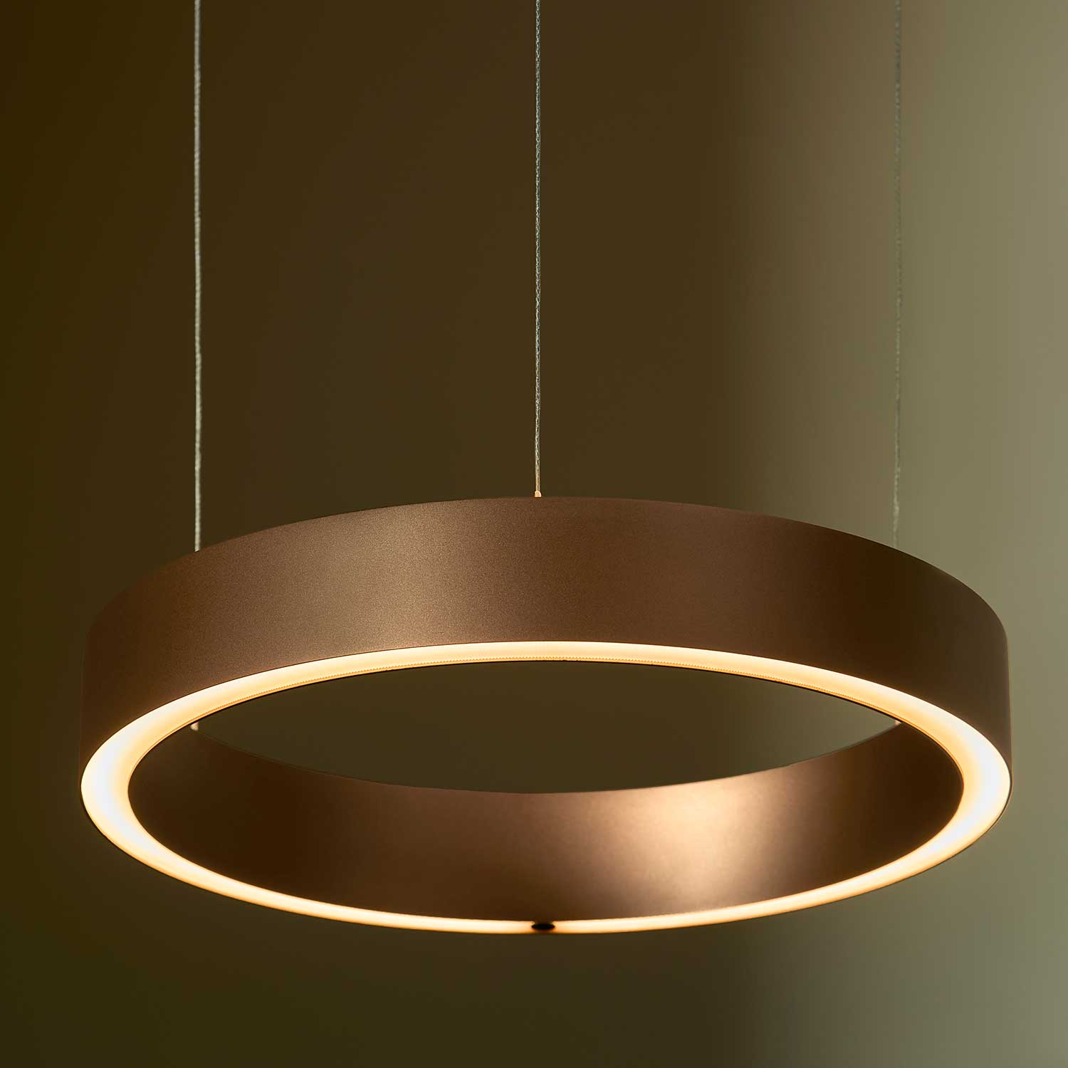Velora Small in caramel brown is a modern pendant light defined by its bold circular form and elegant floating expression. The well-defined ring and warm caramel brown finish give the light an exclusive and inviting character, adding depth and visual presence to the space without overpowering it.
