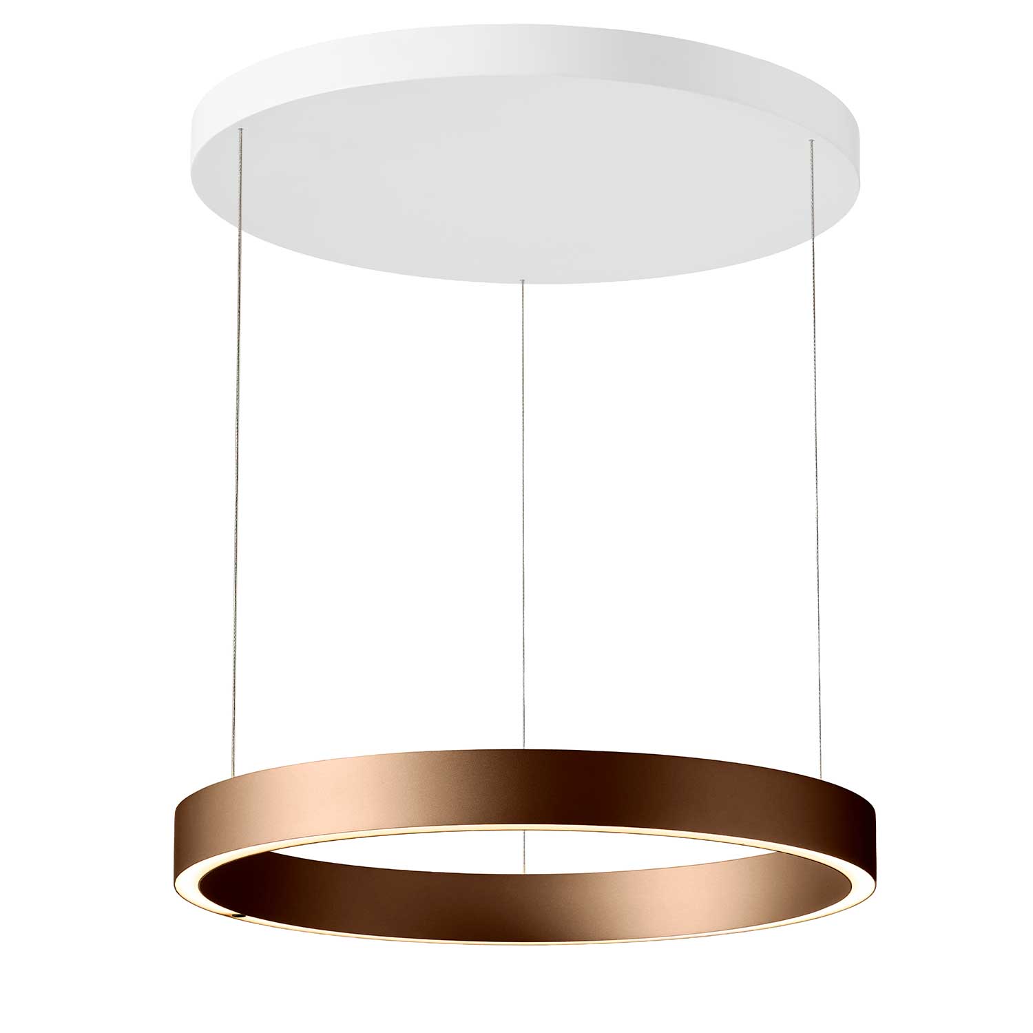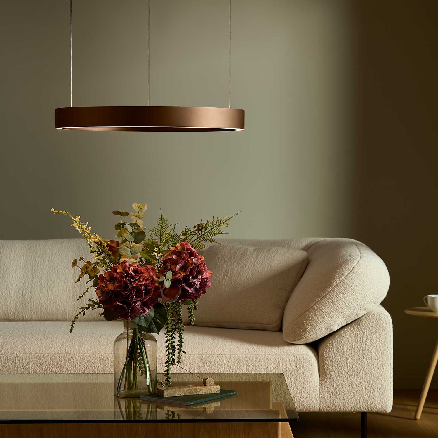 Light is integrated into both the upper and lower surfaces of the ring, distributing illumination in two directions. The upward light creates a soft reflection across the ceiling and enhances the overall ambience, while the downward light provides focused and comfortable illumination beneath the pendant. The two light directions can be controlled independently, allowing precise adjustment of intensity and atmosphere. The integrated 60W LED delivers 4995 lumens at 2700K with a colour rendering index of RA90+, ensuring a warm, natural light quality.